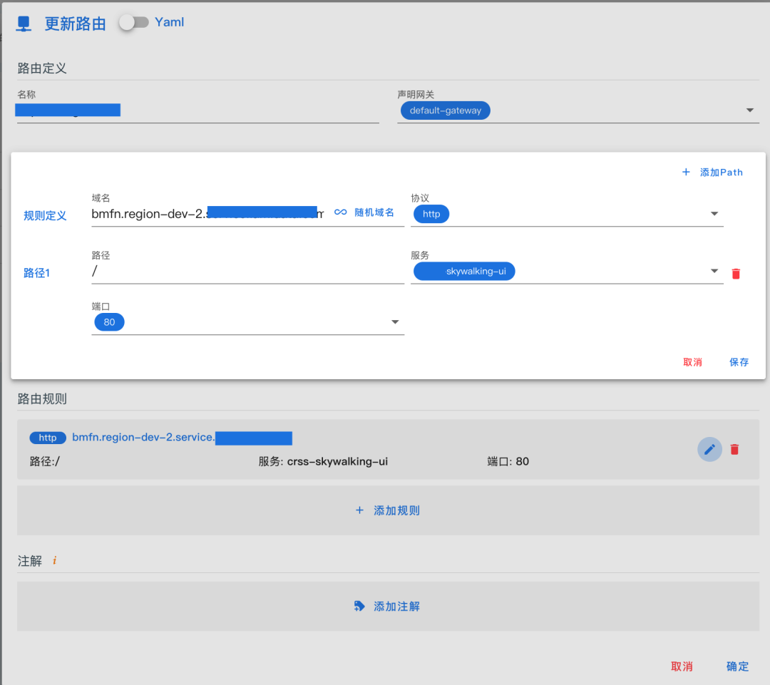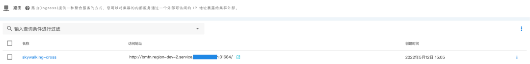 在KubeGems控制台,找到容器服务-->运行时-->路由,创建路由,将skywalking-ui服务地址进行域名映射。我这里直接采用随机域名,用户可以根据自己公司内的域名手动配置。