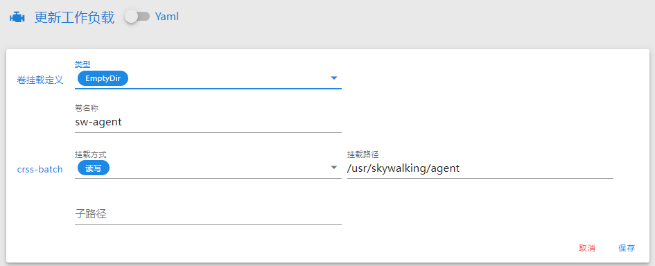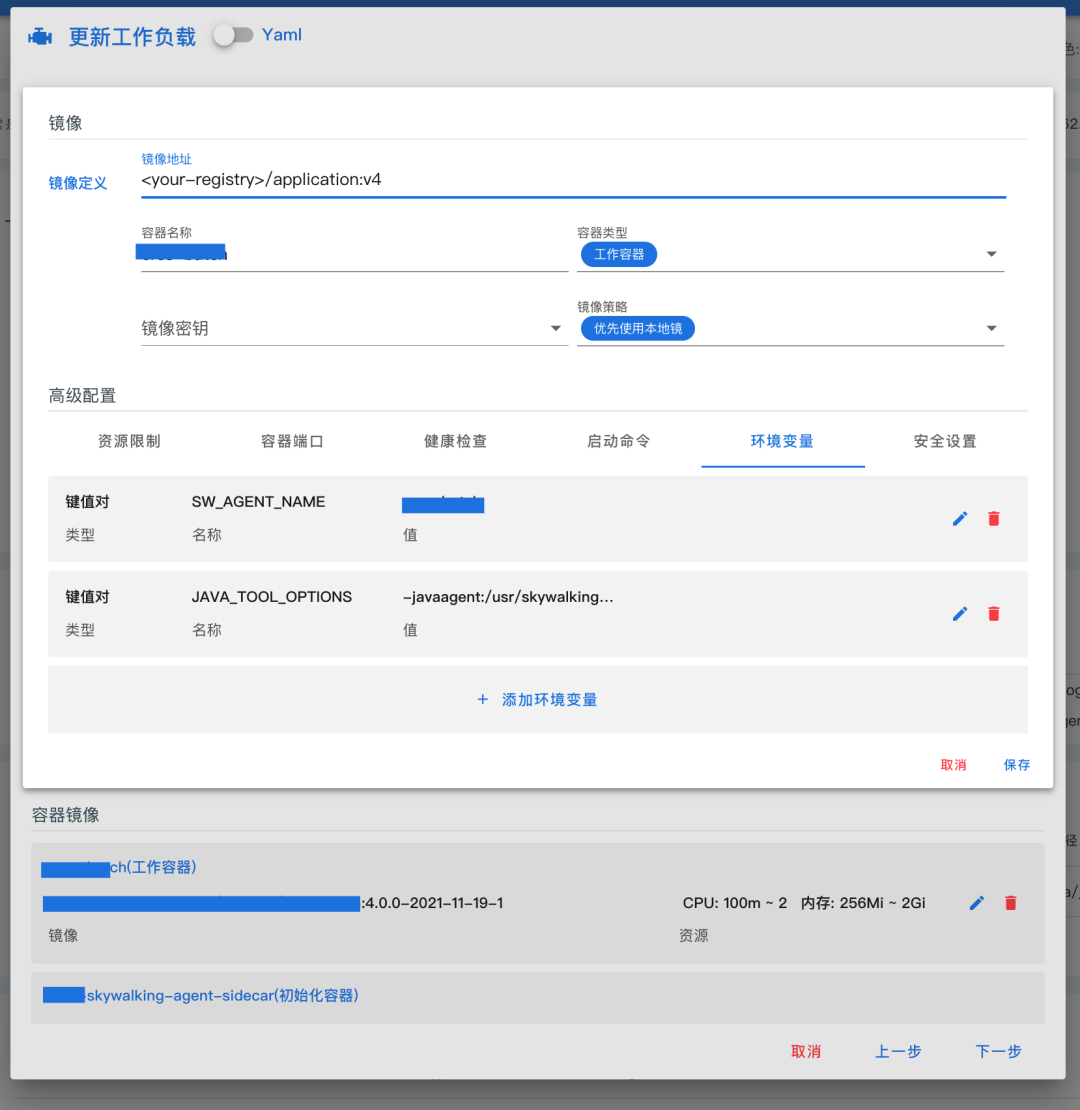 添加容器镜像,选择初始化容器将skywalking-agent-sidecard镜像进行挂载,并添加启动命令