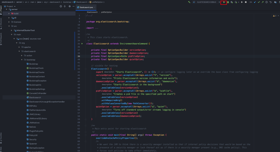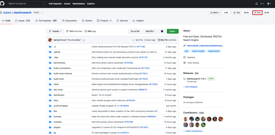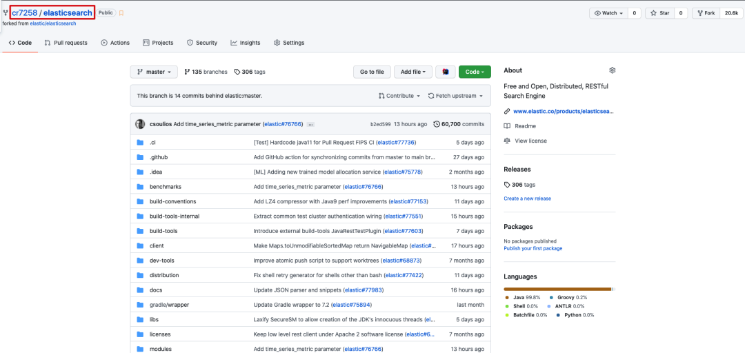 首先 fork 一份 [Elasticsearch 项目] (https://github.com/elastic/elasticsearch) 的代码到自己的 github 仓库,这样看代码的时候写注释可以提交到自己的仓库。
