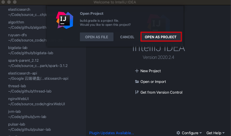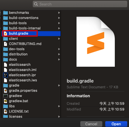 选中 Elasticsearch 源码根目录中的 build.gradle 文件,点击 Open。
