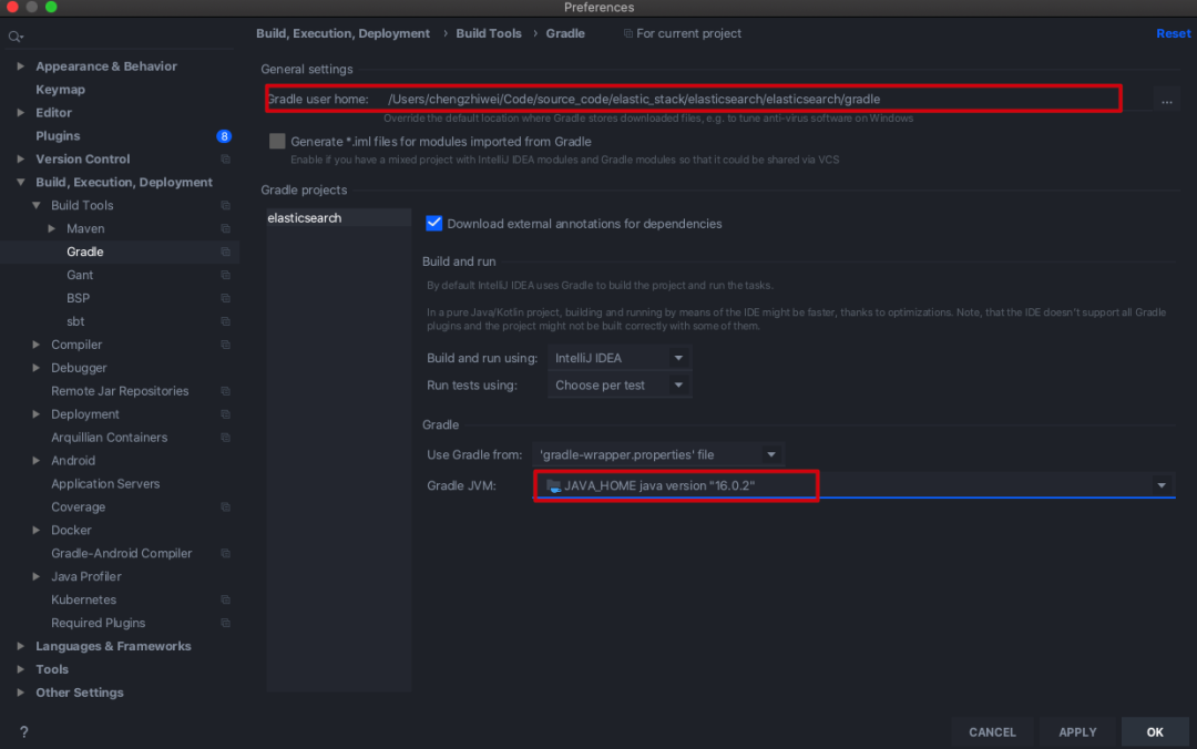 Gradle user home:选择 Elasticsearch 源码包中的 gradle 目录。 Gradle JVM:选择安装的 JDK 16。