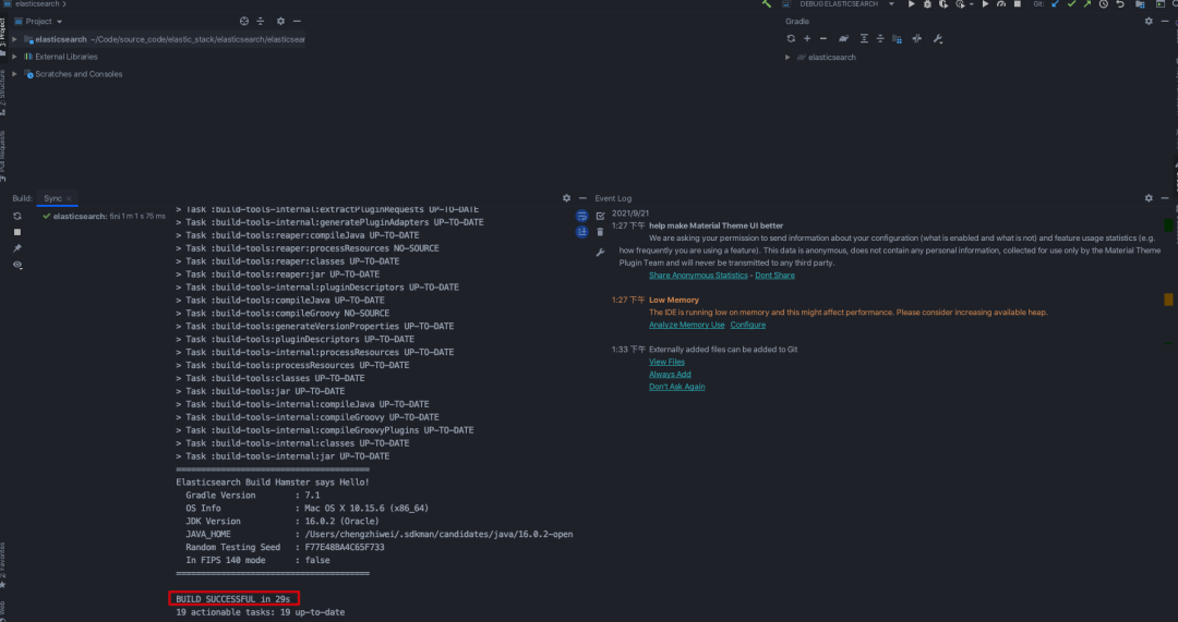 我们编译的是 Elasticsearch 7.14.1 版本,在源码根目录下的 CONTRIBUTING.md 文件中说明了 IntelliJ 和 JDK 的版本要求,Gradle 我们可以不必自行安装,在编译的时候会自动使用源码根目录下 gradlew 脚本进行安装。