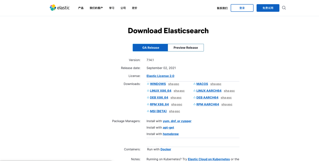 Elasticsearch 发行版下载地址:https://www.elastic.co/cn/downloads/