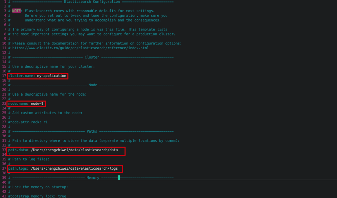 编辑 Users/chengzhiwei/data/elasticsearch/elasticsearch-7.14.1/config/elasticsearch.yml 配置文件,指定集群名,节点名,数据目录,日志目录。
