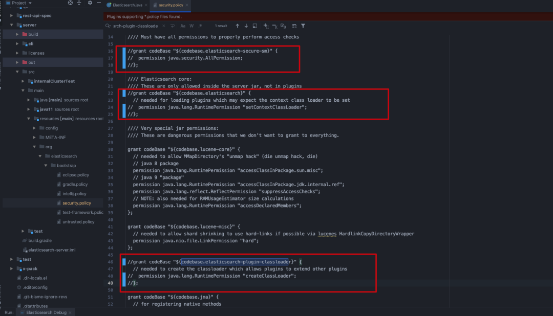 编辑源码包下 server/src/main/resources/org/elasticsearch/bootstrap/security.policy 文件,注释以下内容。