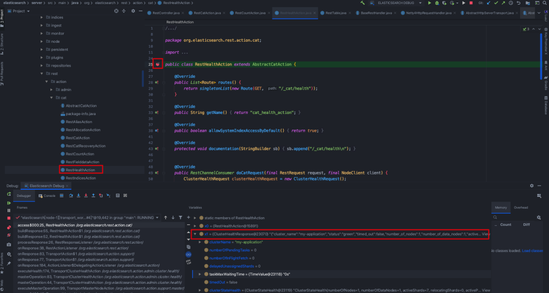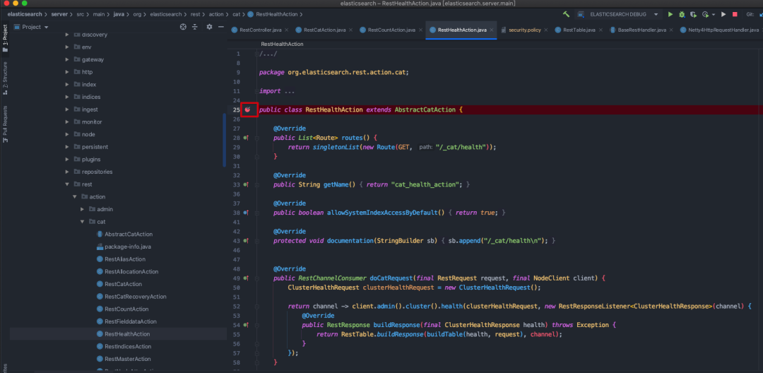 接下来我们 Debug 调试一下,server.main.java.org.elasticsearch.rest.action.cat.RestHealthAction 类上打一个断点,这个类是用于处理查询集群状态请求的。