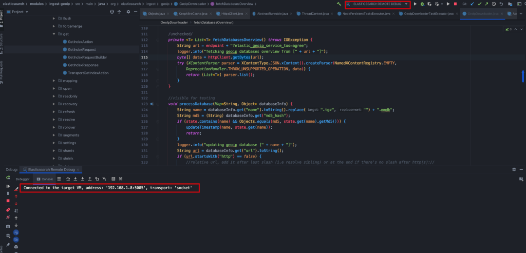启动 Remote 配置,看到以下输出说明成功连接到了远程 Elasticsearch,接下来就可以像在本地一样 Debug 调试了。