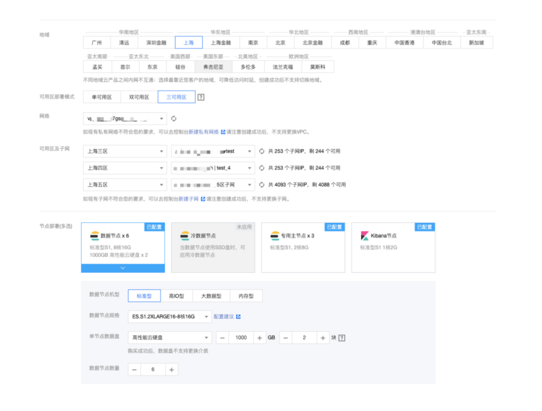 例如下图所示,在上海地域选择了三可用区集群的部署,数据节点数量选择 6 个。Elasticsearch 会自动将 6 个数据节点均衡地分布在三个可用区中,并对每个节点标记上可用区属性,从而可以通过可用区感知功能将索引的分片自动分布在多可用区中。