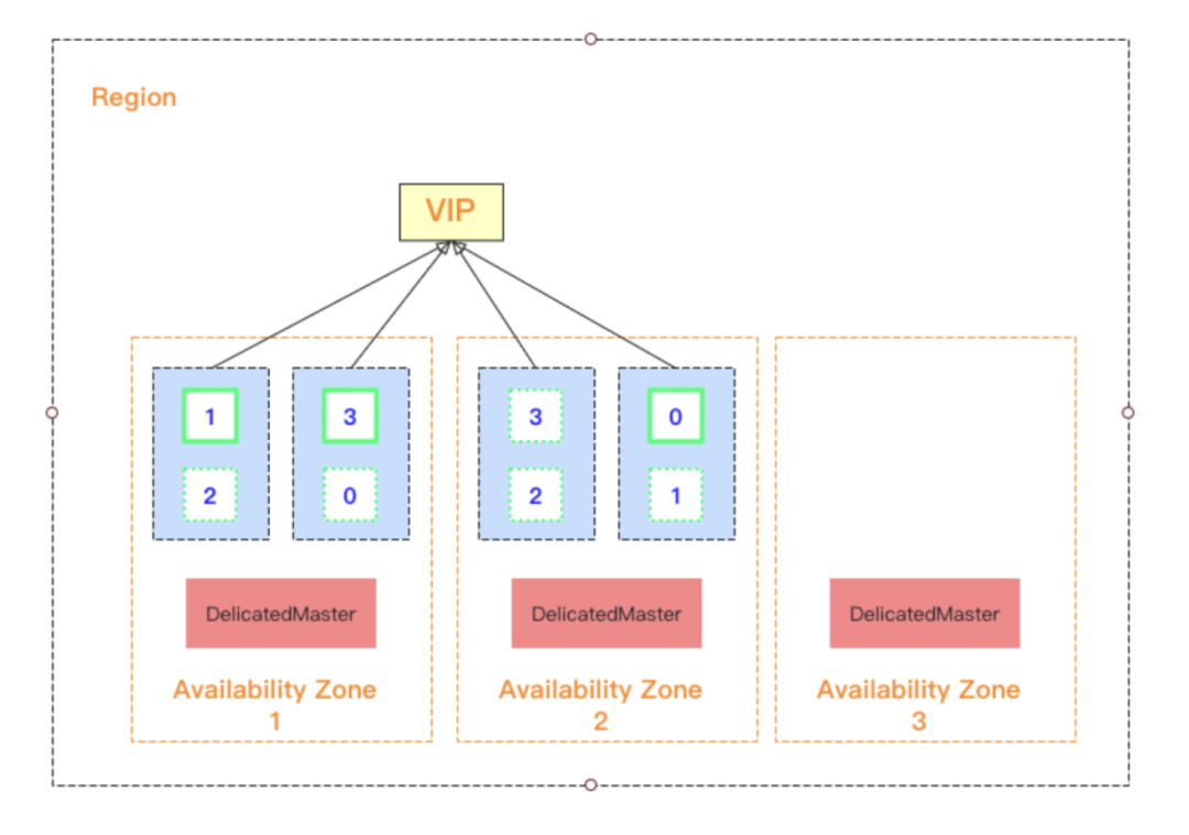 当选择三可用区部署时,会在每个可用区部署一个专用主节点,从而保障任何一个可用区不可用时,依然能够选出 Master 节点; 当选择双可用区部署时,为了避免出现一个可用区上分布两个专用主节点且出现“该可用区不可用”导致选不出 Master 节点的情况,腾讯云 ES 会选择一个隐藏可用区用来专门部署专用主节点。