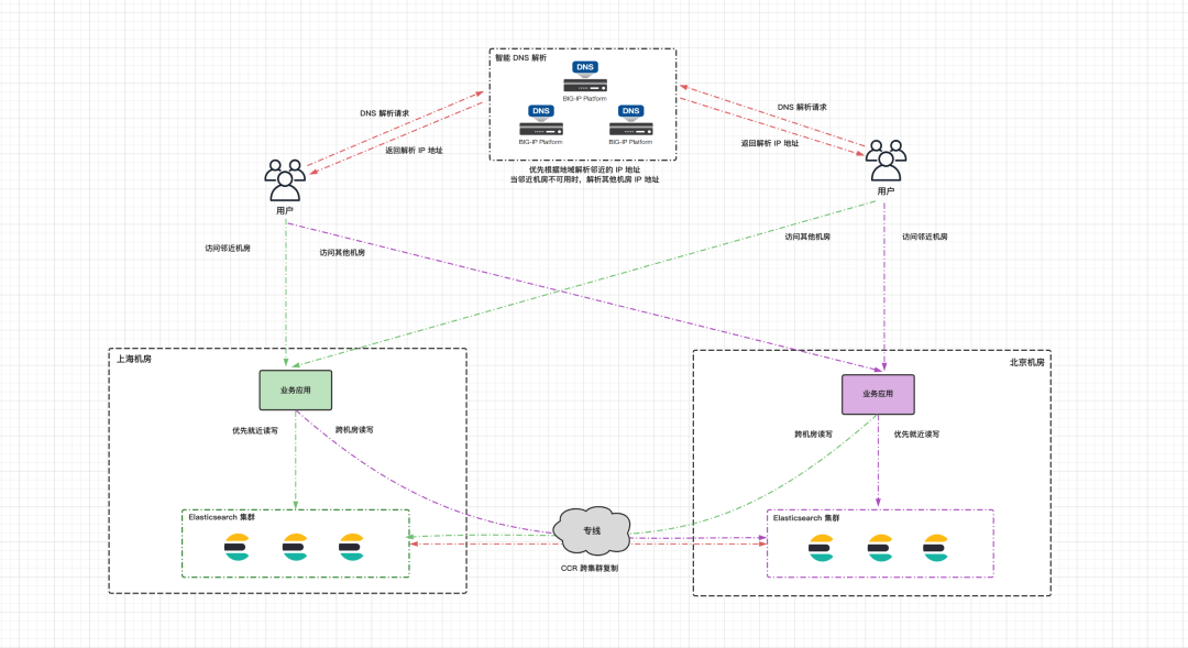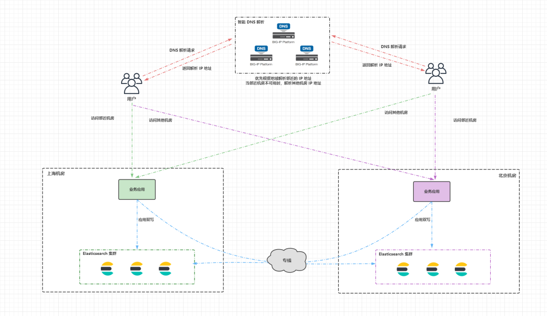 下图是双机房部署的一个整体架构图,在两个机房以双活的形式各部署一套 Elasticsearch 集群,同时对外提供服务,两个 Elasticsearch 集群配置 CCR 双向复制。机房之间的网络通过专线打通,用于承载 CCR 跨集群复制以及业务应用跨机房访问 Elasticsearch 集群的流量。业务应用的读写请求优先访问本机房的 Elasticsearch 集群,当本机房的集群出现不可用时,访问备机房的 Elasticsearch 集群。在公网部署一套智能 DNS 服务,根据用户的 IP 地址将域名解析到邻近用户机房的公网 IP,当整个机房出现故障时,才将域名解析到备机房的公网 IP。