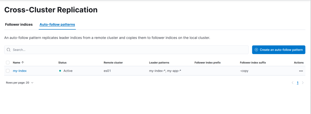 跨集群复制使用主动-被动模型(active-passive model),复制更改的索引称为“追随者索引”(follower Index),被复制的索引称为“领导者索引”(leader index)。当 leader index 收到写入时,follower index 会从远程集群上的 leader index 上基于文档操作实现订阅复制。当配置复制规则时,可以指定特定的索引进行复制;也可以通过 auto-follow pattern 以通配符的形式自动匹配多个索引,创建复制规则后新创建的索引也会自动匹配。