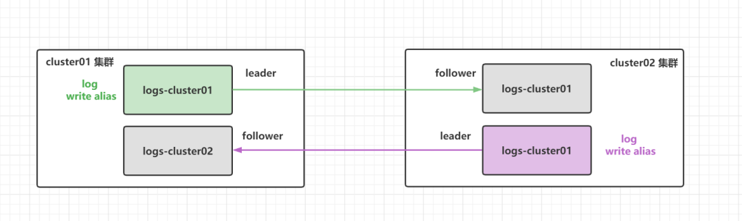 索引中的数据将会通过 CCR 跨集群复制从集群 cluster02 中获取;集群 cluster02 的别名设置相反。通过以上设置,应用程序在读写的时候都往 logs