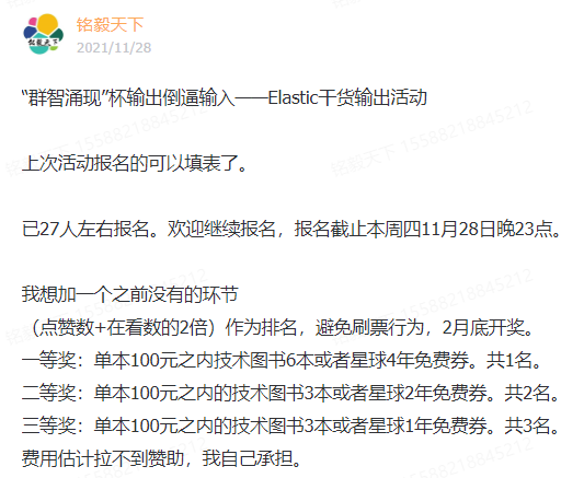 上个月,死磕 Elasticsearch 知识星球搞了:“群智涌现”杯输出倒逼输入——Elastic干货输出活动。