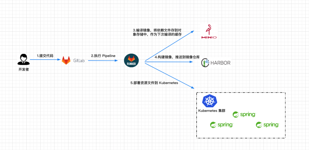 配置文件运行 Pipeline 中各阶段的任务。我总共定义了 3 个阶段:compile,build,deploy。3.在 compile 阶段,Gitlab Runner 将项目编译成 jar 包,使用 MinIO 作为缓存,首次编译项目时会从 Maven 官网拉取依赖,之后会将依赖压缩后上传至 MinIo,在下一次编译时就可以直接从 MinIO 下载依赖文件。 4.在 build 阶段,Gitlab Runner 使用在 compile 阶段编译生成的 jar 包构建 Docker 镜像,并将镜像推送至镜像仓库。 5.在 deploy 阶段,Gitlab Runner 使用构建好 Docker 镜像在 Kubernetes 集群中部署应用。