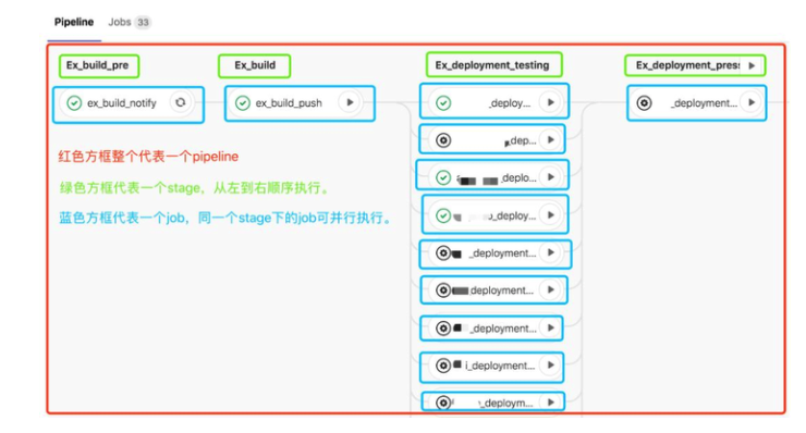 以 Gitlab 中的某个实际的 Pipeline 为例解释 Pipeline,Stage,Job 的含义,具体请看下图。