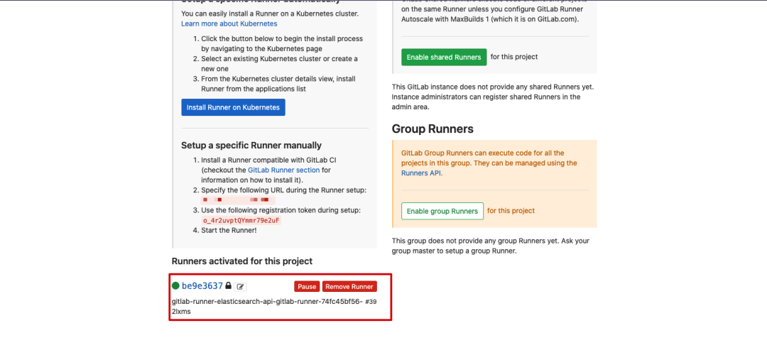 gitlabUrl:设置 Gitlab 的 IP 地址。 runnerRegistrationToken:设置 Gitlab Runner 注册的 token。进入项目 -> Settings -> CI/CD -> Runners settings 查看注册 Gitlab Runner 所需的 registration token。