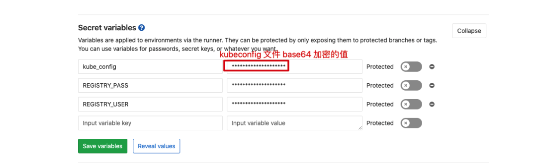 为了安全性,我们将镜像仓库的用户名、密码以及 Kubernetes 集群的 kubeconfig 文件设置在 Gitlab 的 Secret variables 中。进入项目 -> Settings -> CI/CD -> Secret variables。注意 kubeconfig 文件的值是 base64 加密后的,镜像仓库的用户名和密码正常设置即可。