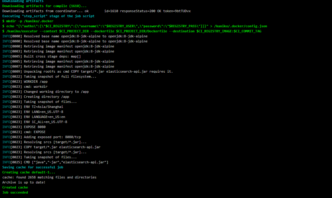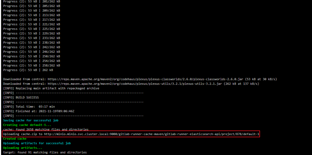 第一次 Pipeline 在 compile 阶段会比较慢,因为编译项目时需要从公网下载依赖,在编译完成以后会将 cache 目录中的依赖压缩打包后上传到 Minio,等到下一次编译就可以直接拿来使用,避免重复去公网下载,速度会加快不少。