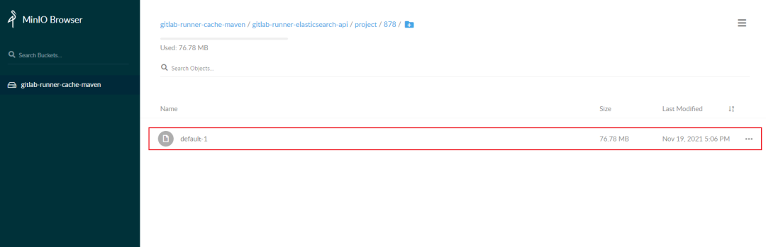 在 MinIO 上可以看到 Gitlab Runner 上传上来的依赖的压缩文件。
