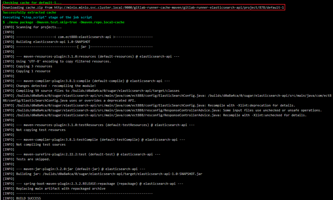 可以看到这次在 compile 阶段并没有去公网下载依赖,而是直接使用从 Minio 下载了依赖。整个 Pipeline 流程也从 5 分钟缩短至 1 分钟。