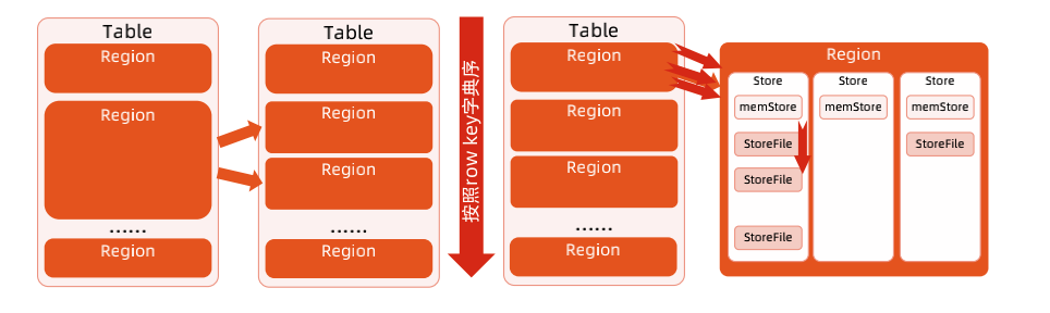 Table:表,一个表包含多行数据。 Rowkey:行的主键,唯一标识一行数据,用于检索记录。 Column family:列簇,同一个列簇的所有成员具有相同的列簇前缀,通常将同一类型的列存放在一个列簇下。 Qualifier:列,以列簇作为前缀,格式为 Column family:Qualifier。 Timestamp:时间戳,插入单元格时的时间戳,默认作为单元格的版本号。不同版本的数据按照时间戳倒序排序,即最新的数据排在最前面。 Cell:单元格,在 HBase 中,值作为一个单元保存在单元格中。要定位一个单元,需要满足 “rowkey + column family + qualifier + timestamp” 四个要素。每个 cell 保存着同一份数据的多个版本。cell 中没有数据类型,完全是字节存储。 Master:主要负责 HBase 系统的各种管理工作: 处理用户的各种管理请求,包括建表、修改表、权限操作、切分表、合并数据分片以及 Compaction 等。 管理集群中所有 RegionServer,包括 RegionServe r中 Region 的负载均衡、RegionServer 的宕机恢复以及 Region 的迁移等。 清理过期日志以及文件,Master 会每隔一段时间检查 HDFS 中 HLog 是否过期、HFile 是否已经被删除,并在过期之后将其删除。 RegionServer:RegionServer 主要用来响应用户的 IO 请求,是 HBase 中最核心的模块,由 WAL(HLog)、BlockCache 以及多个 Region 构成。 Store:由两部分组成:MemStore 和 StoreFile。MemStore 称为写缓存,用户写入数据时首先会写到 MemStore,当 MemStore 写满之后(缓存数据超过阈值,默认 128M)系统会异步地将数据 flush成一个 HFile 文件。显然,随着数据不断写入,HFile 文件会越来越多,当 HFile 文件数超过一定阈值之后系统将会执行 Compact 操作,将这些小文件通过一定策略合并成一个或多个大文件。 StoreFile(HFile):HBase 的数据最终是存放在 HDFS 上的,StoreFile 在 HDFS 上称为 HFile。 Region:数据表的一个分片,当数据表大小超过一定阈值就会“水平切分”,Region 是集群负载均衡的基本单位。一个 Region 由一个或者多个 Store 构成, Store 的个数取决于表中列簇(column family)的个数,有多少个列簇就有多少个 Store。