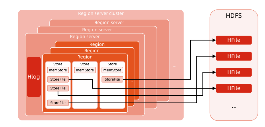 HLog:Write ahead log(WAL),HLog 在 HBase 中有两个核心作用:其一,用于实现数据的高可靠性,HBase 数据随机写入时,并非直接写入 HFile 数据文件,而是先写入缓存,再异步刷新落盘。为了防止缓存数据丢失,数据写入缓存之前需要首先顺序写入 HLog,这样,即使缓存数据丢失,仍然可以通过 HLog 日志恢复;其二,用于实现 HBase 集群间主从复制,通过回放主集群推送过来的 HLog 日志实现主从复制。