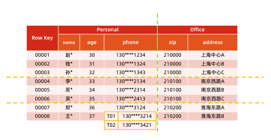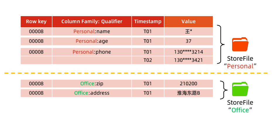 在下图中有两个列簇:Personal 和 Office,Personal 列簇中存放了和个人信息相关的三个列:name,age,phone。Office 列簇中存放了和办公地点相关的两个列:zip,address。rowkey 为 00008 的 personal:phone 的 cell 存放了两个版本的数据。