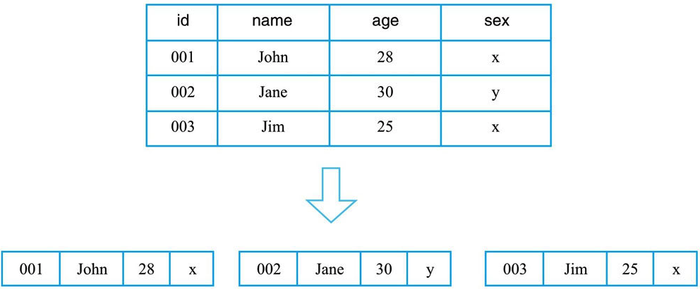 行式存储:行式存储系统会将一行数据存储在一起,一行数据写完之后再接着写下一行,最典型的如 MySQL 这类关系型数据库。