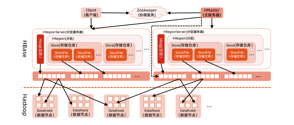 HBase 是典型的 Master-Slave 模型,系统中有一个管理集群的 Master 节点以及大量实际服务用户读写的 RegionServer 节点。 HBase 中所有数据最终都存储在 HDFS 系统中,为数据提供了高可靠的保障。 Zookeeper 节点为 HBase 集群提供了协调管理的作用。 实现 Master 高可用:通常情况下系统中只有一个 Master 工作,一旦 ActiveMaster 由于异常宕机,ZooKeeper 会检测到该宕机事件,并通过一定机制选举出新的 Master,保证系统正常运转。 管理系统核心元数据:比如,管理当前系统中正常工作的 RegionServer 集合,保存系统元数据表 hbase:meta 所在的 RegionServer 地址等。 参与 RegionServer 宕机恢复:ZooKeeper 通过心跳可以感知到 RegionServer 是否宕机,并在宕机后通知 Master 进行宕机处理。 实现分布式表锁:HBase 中对一张表进行各种管理操作(比如 alter 操作)需要先加表锁,防止其他用户对同一张表进行管理操作,造成表状态不一致。和其他 RDBMS 表不同,HBase 中的表通常都是分布式存储,ZooKeeper 可以通过特定机制实现分布式表锁。