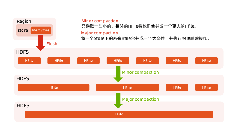 Minor Compaction:会将邻近的若干个 HFile 合并,在合并过程中会清理 TTL 的数据,但不会清理被删除的数据。Minor Compaction 消耗的资源较少,通过少量的 IO 减少文件的个数,提升读取操作的性能,适合高频率地跑。 Major Compaction:会将一个 Store 下的所有 HFile 进行合并,并且会清理掉过期的和被删除的数据,即在 Major Compaction 会删除全部需要删除的数据。一般情况下,Major Compaction 时间会持续比较长,整个过程会消耗大量系统资源,对上层业务有比较大的影响。因此,生产环境下通常关闭自动触发 Major Compaction 功能,改为手动在业务低峰期触发。