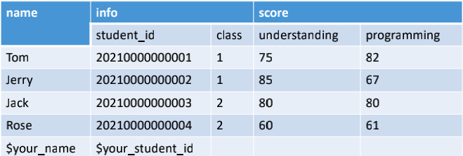 从逻辑视图来看,HBase 中的数据是以表形式进行组织的,而且和关系型数据库中的表一样,HBase 中的表也由行和列构成。
