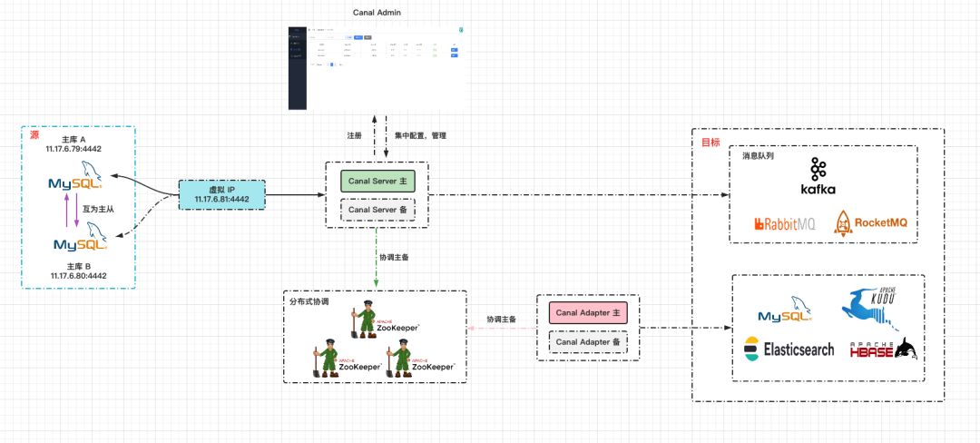Instance:对应 Canal Server 里的 Instance,一个最小的订阅 MySQL 的队列。 Server:对应 Canal Server,一个 Server 里可以包含多个 Instance,Canal Server 负责订阅 MySQL 的 binlog 数据,可以将数据输出到消息队列或者为 Canal Adapter 提供消息消费。原本 Canal Server 运行所需要的 canal.properties 和 instance.properties 配置文件可以在 Canal Admin WebUI 上进行统一运维,每个 Canal Server 只需要以最基本的配置启动。 (例如 Canal Admin 的地址,以及访问配置的账号、密码即可) 集群:对应一组 Canal Server,通过 Zookeeper 协调主备实现 Canal Server HA 的高可用。