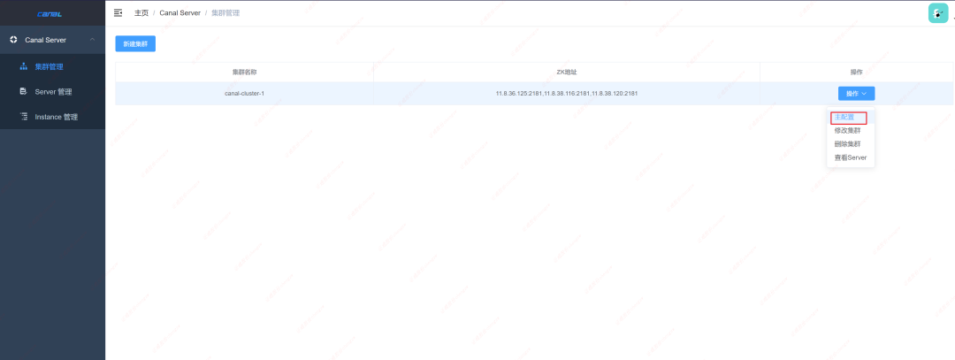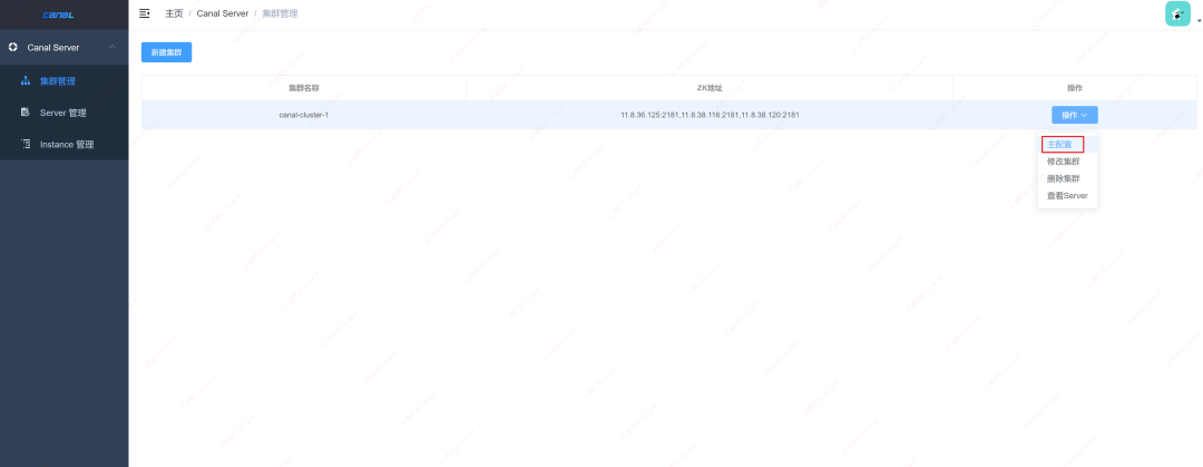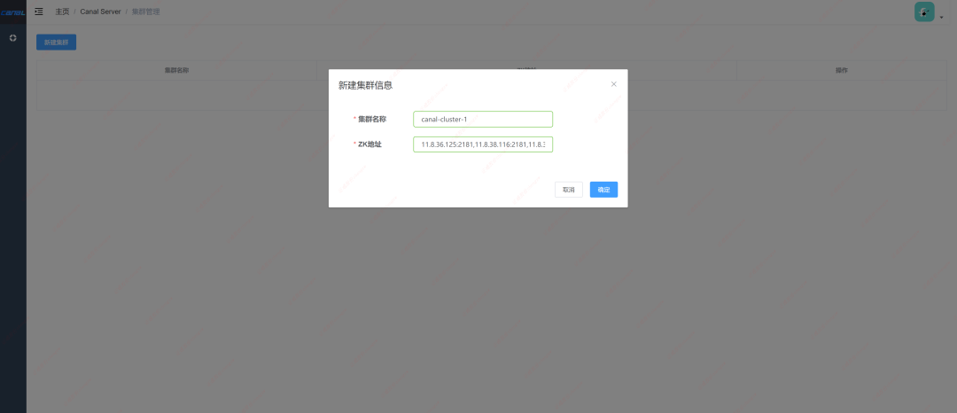 进入 Canal Admin 集群管理页面,点击新建集群,添加集群名称和 Zookeeper 地址。