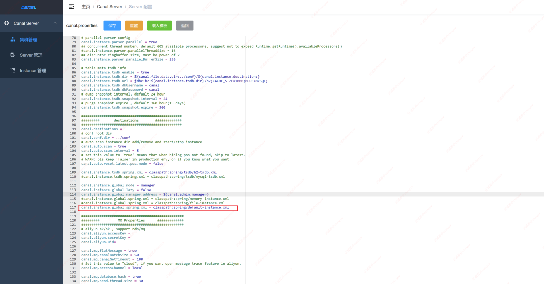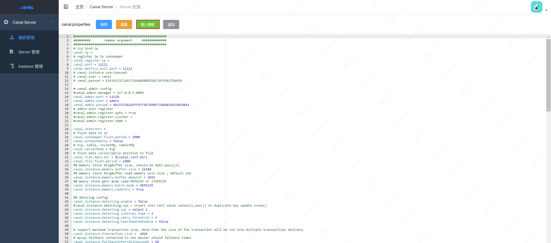 因为这里使用 Canal Admin 部署集群,所以 Canal Server 节点只需要配置 Canal Admin 的连接信息即可,真正的配置文件统一通过 Canal Admin 界面来管理。编辑 vim /software/canal-server/conf/canal_local.properties 文件: