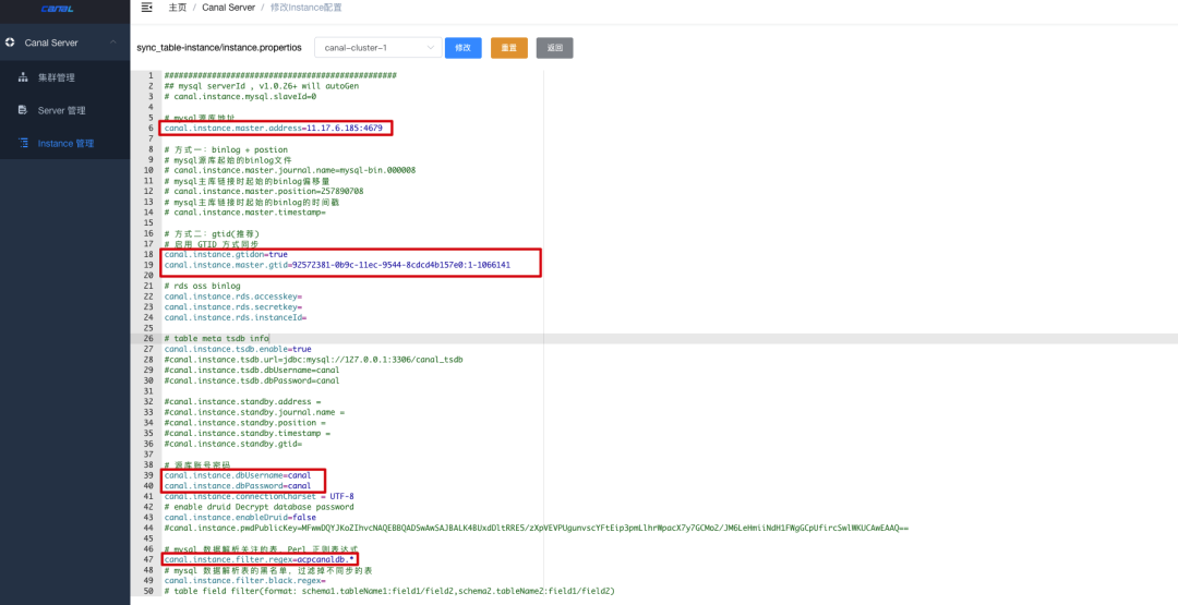 和前面同步 MySQL 的 Instance 相比,这里有 2 个地方需要修改: