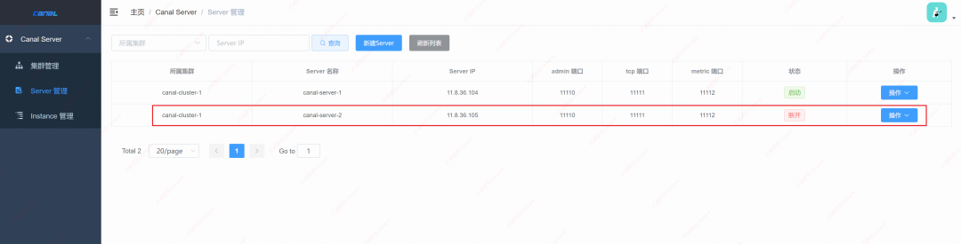 在 Canal Admin 界面可以看到这个 Canal Server 此时已经断开连接。