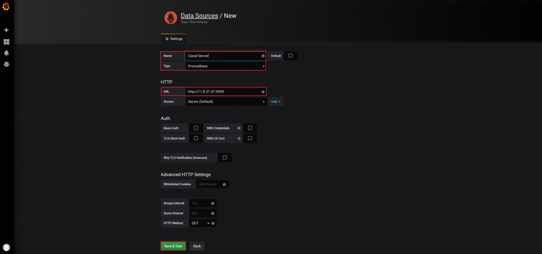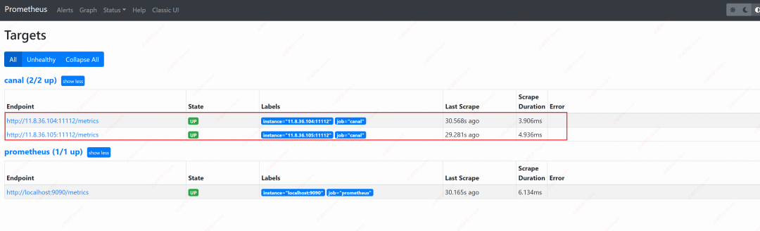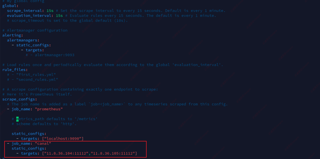 编辑 Prometheus 配置文件 vim prometheus.yml,添加 canal 的 job。