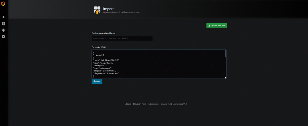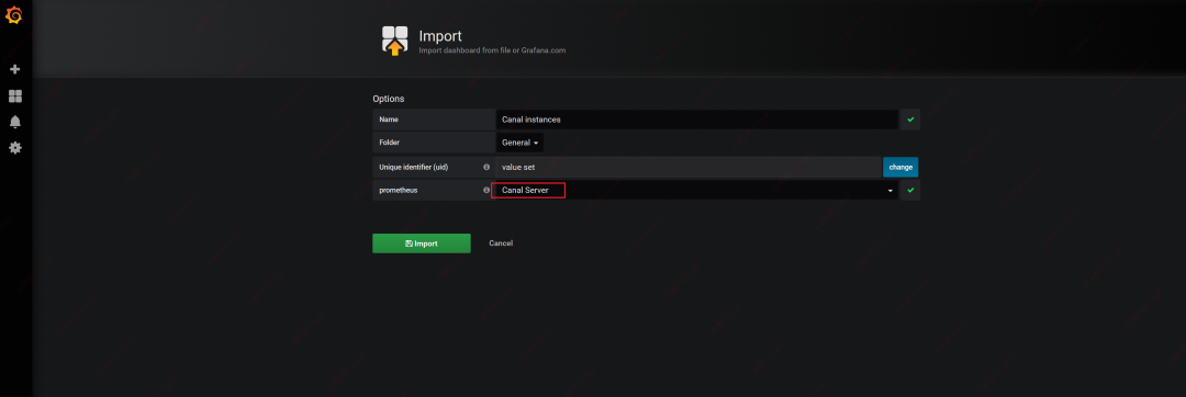 导入[模板] (https://raw.githubusercontent.com/alibaba/canal/master/deployer/src/main/resources/metrics/Canal_instances_tmpl.json),将 json 文本黏贴到输入框中,点击 load。