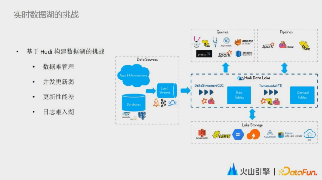 在尝试规模化落地的过程中,我们主要遇到了四个挑战:数据难管理、并发更新弱、更新性能差,以及日志难入湖。