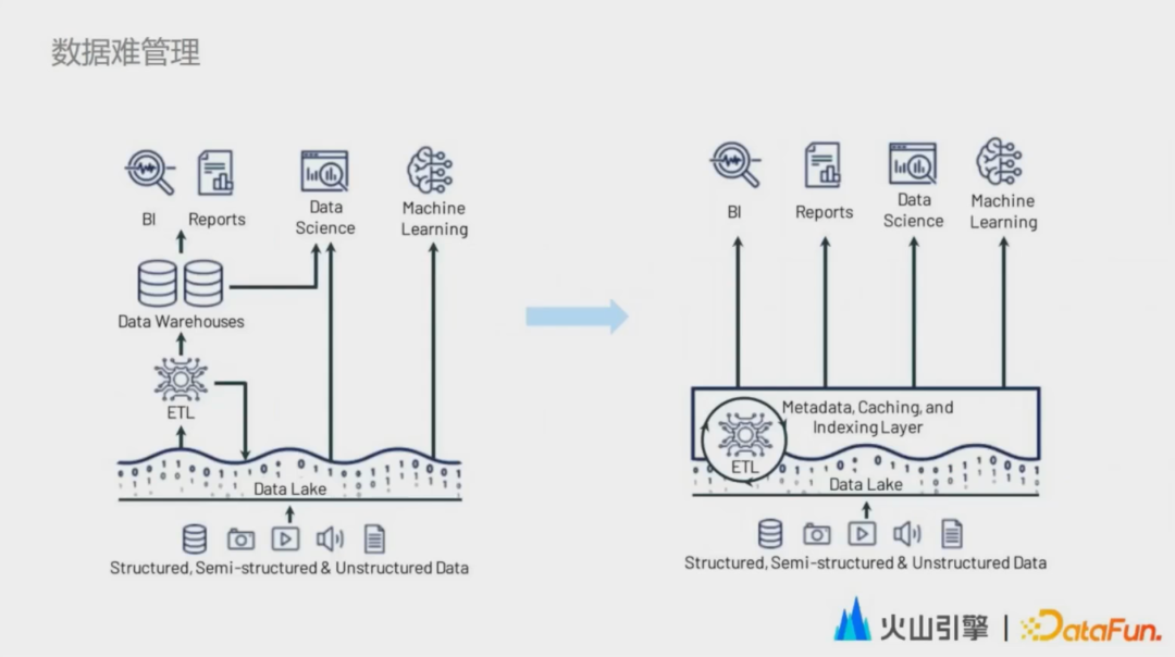 为了解决这个数据难管理的问题,Databricks 提出了一个Lakehouse 的架构,就是在存储层之上去构建统一的元数据缓存和索引层,所有对数据湖之上数据的使用都会经过这个统一的一层。这和我们的目标很相似,但是现实比较残酷,我们面临的是海量存量数据,这些存量数据不管是数据格式的迁移,还是使用方式的迁移,亦或是元数据的迁移,都意味着巨大的投入。因此在很长一段时间里,我们都会面临数仓和数据湖共存这样一个阶段。在这一阶段,两者的连通性是用户最为关心的。