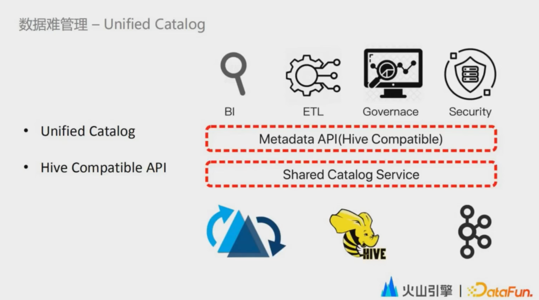 我们在数据湖和数仓之上,构建了一层统一的元数据层,这层元数据层屏蔽了下层各个系统的元数据的异构性,由统一的元数据层去对接 BI 工具,对接计算引擎,以及数据开发、治理和权限管控的一系列数据工具。而这一层对外暴露的 API 是与 Hive 兼容的。