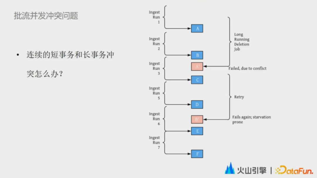 下一步的并发问题是批流并发冲突的问题。批流并发冲突问题类似于一个我们在传统数据湖中遇到的场景,就是有一连串的小事务和一个周期比较长的长事务,如果这两者发生冲突,应该如何处理。