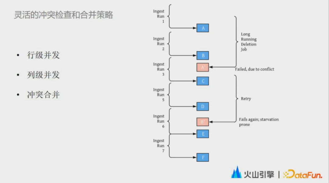 为了解决批流冲突的问题,我们的思路是提供更灵活的冲突检查和数据合并策略。最基础的就是行级并发。首先两个独立的writer写入的数据在物理上是隔离的,借助文件系统的租约机制也能够保证对于一个文件同时只有一个writer。所以这个冲突实际上不是发生在数据层面的,而是发生在元数据层面。那数据的冲突与否,就可以交由用户来定义。很多时候入湖的数据实际上并不是一个现实中正在发生的事情,而是一个现实操作的回放。比如图中的这个场景,我们假设删除的作业是针对一个特定的 Snapshot。即使有冲突,我们可以认为整个删除的过程是瞬时完成的,后续的新事物可以追加发生在这次删除作业之后。