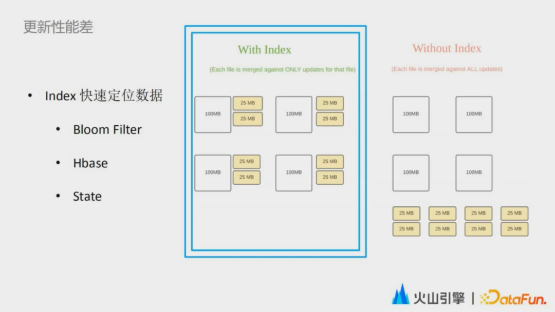 我们最早选择基于Hudi也是因为可扩展的索引系统,通过这个索引系统可以快速地定位到需要跟新的文件。这带来了三点好处: