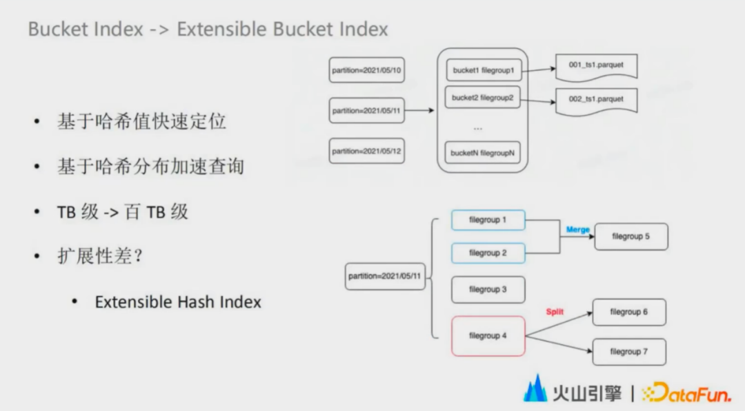 还有一个就是当数据真正发生这merge 和 split 的时候,这个阶段我们是如何处理的?这个阶段其实这样的,当一个文件发生分裂的时候,它原始的数据是不用动的。我们可以认为它就是一个引用,因为我们匹配到了新的file group。我们可以找到之前它引用的原生没有扩容的这个bucket,然后我们依旧还是可以去把这个数据拿到,并且在这个没有扩容的file group上,我们可以套一层 hash filter ,然后可以保证这个数据不会有重复。最后我们异步地去做一个 clustering这个时候真正地去对数据物理上面去完成一个历史数据的重分布。