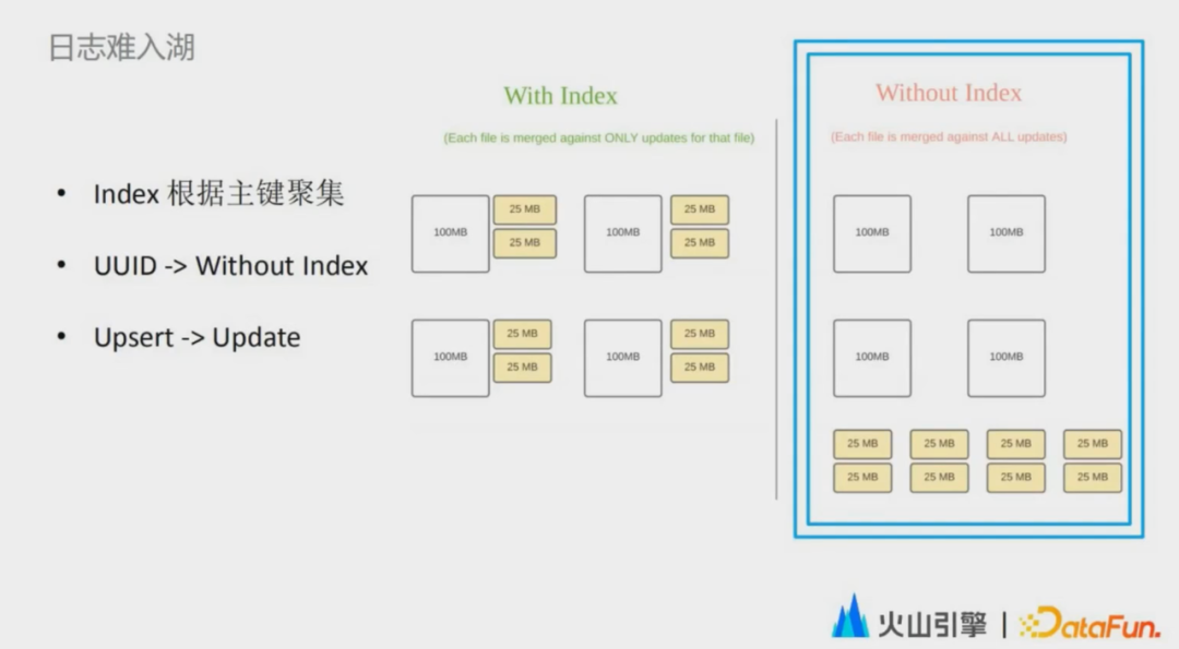 一个是避免读取不需要的文件;二是避免更新不必要的文件;三是避免将更新的数据和历史的数据做分布式关联,而是通过提前将文件分好组的方式直接在文件组内进行合并。