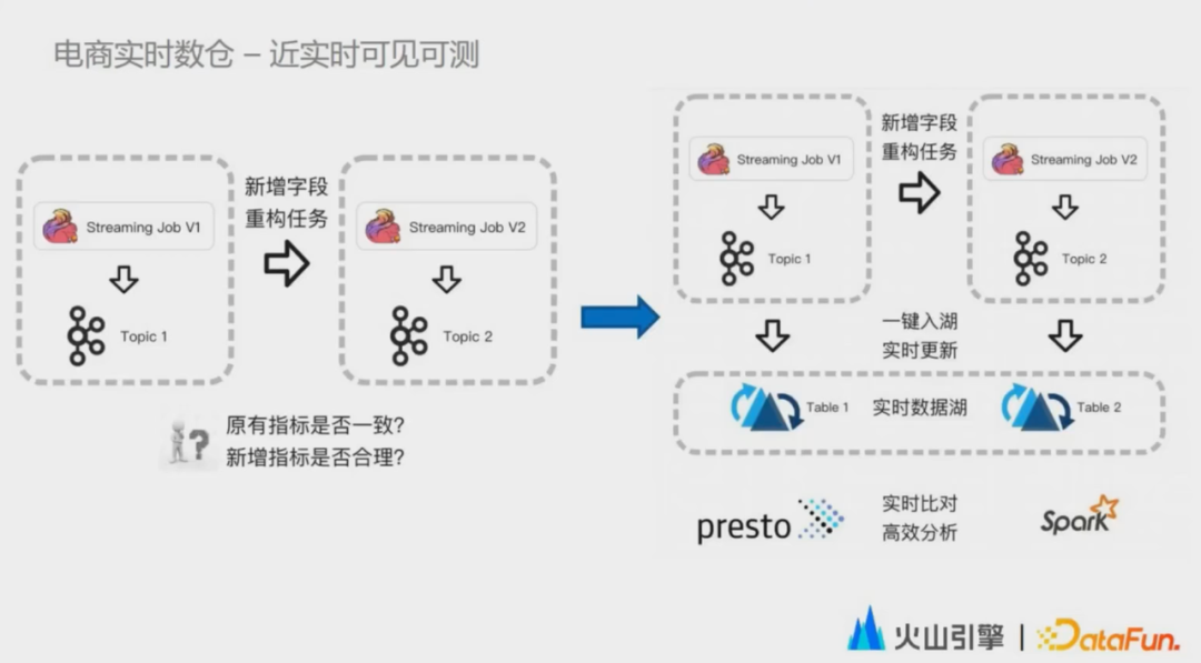 坦白说,在实时数据湖的落地初期,对于数据湖是否能在实时数仓中真正胜任,大家都是存疑的。因此最早的切入点也比较保守,用在数据的验证环节。在电商的实时数仓中,由于业务发展快,上游系统变更,以及数据产品需求都非常多。导致实时数仓开发周期短,上线变更频繁。当前这个实时的数据的新增字段和指标逻辑变更,或者在任务重构优化时,都要对新版本的作业生成的指标进行验证。验证的目标主要有两点,一是原有指标,数据是否一致,二是新增指标的数据是否合理。