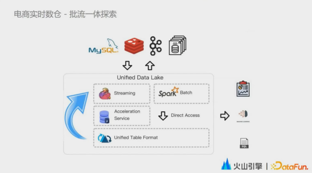 同时在这套架构中,为了解决实时数据湖从分钟级到秒级的最后一公里,我们在实时引擎与数据湖的表之间增加了一层数据加速服务。在这层数据加速服务之上,多个实时作业可以做到秒级的数据流转,而这个服务也会解决频繁流式写入频繁提交导致的小文件问题,为实时数据的交互查询进一步提速。
