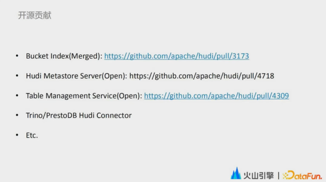 其它一些功能我们也计划分两个阶段贡献到社区。比如 RPC 42,将我们的湖表管理服务与大家共享,长期来看能够做到数据湖上的表的自动优化。还有 Trino 和Presto DB 的 Hudi Connector,目前也是在和Hudi背后的生态公司共同推进投入到开源社区当中。