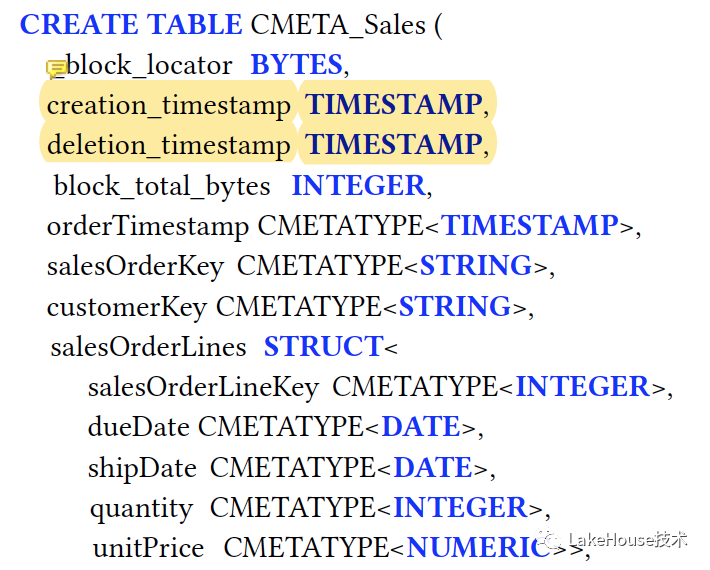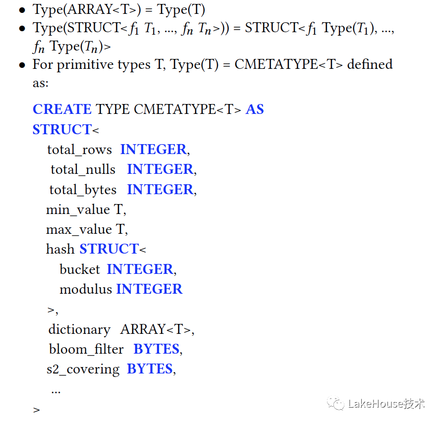 • 元数据管理能力:bigquery支持万列的表,支持历史表的timetravel。一开始的元数据支持粗粒度的元数据,类似odps以及hive metastore,随着表的规模增加单点的性能问题凸显,分析性能的前提在于要读取的列的数量,这个是新元数据设计的基础。data skip表的表结构:表的字段和原表完全一致,只是字段的类型会被替换为一个结构体的类型CMETATYPE: